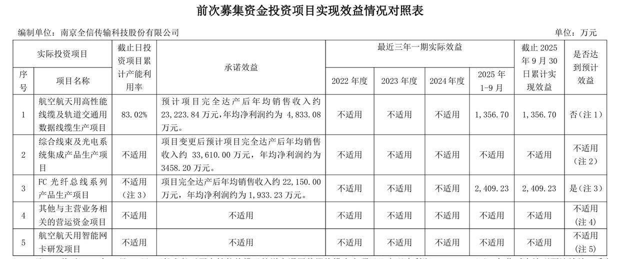 此外,全信股份披露的前次募集资金使用情况报告显示,该公司2021年定增募投项目中“航空航天用高性能线缆及轨道交通用数据线缆生产项目”效益不及预期。
